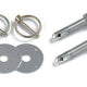 Flip style hood safety pins. Includes pins, jam nuts, scuff plates and flip style safety pins. Steel construction, 3/8" - 24.